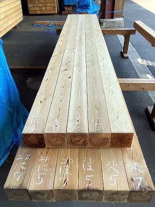 次に、図面を見ながら番付をします。大工さんが手刻みをしていたころはこの番付は大工さんの仕事でしたが、現在はプレカット工場で刻むため、単に化粧柱を用意しただけではベストな使われ方はされません。