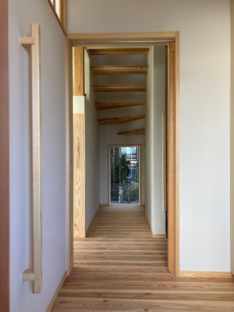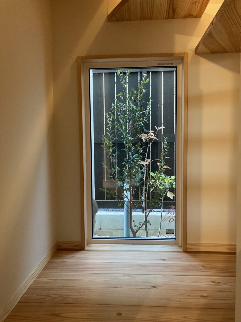 一方玄関を入ると、1枚の引き戸があり、その向こうには階段下のスペースを利用した中庭が見える小窓が設置してあり、帰宅したときに疲れを癒してくれそうです。