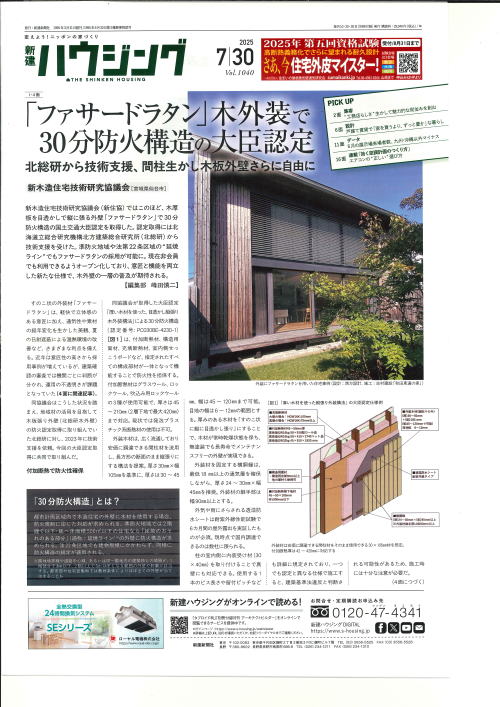 2025年7月30日発行 Vol.1040 新建ハウジングの見出しです。北総研からの技術支援を受けて、新住協がファサードラタンで30分防火構造の国土交通大臣認定を取得したとのことです。