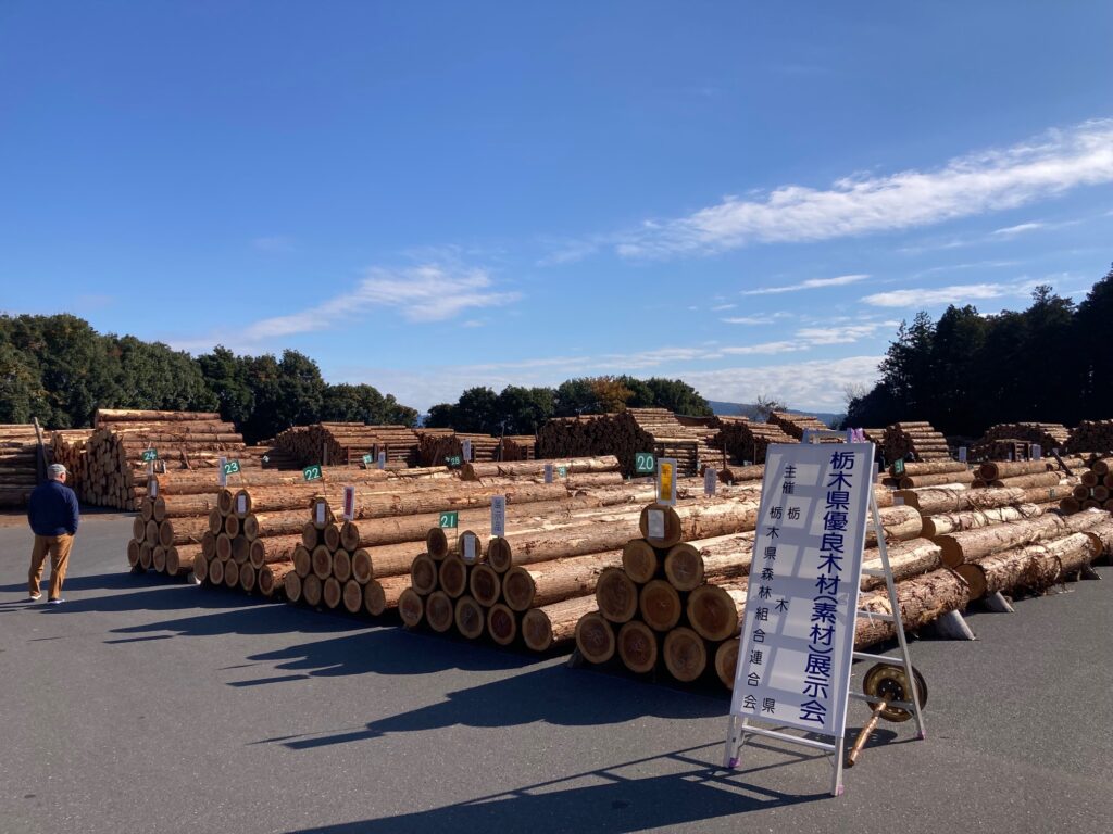 11月20日(木)、栃木県森林組合連合会(県森連)主催の秋の展示会が大田原木材共販所にて開催されました。栃木県内最大級の原木の展示会(販売会)で、良材が多く出荷されるため、茨城県や群馬県はもとより、秋田県からも良材を求めて製材業者が集まります。