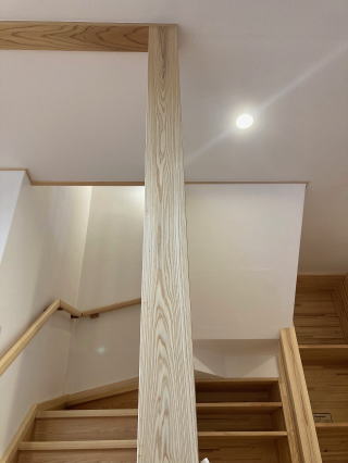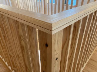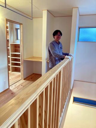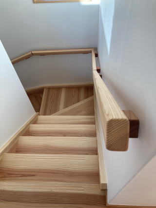 階段も、とちぎ八溝杉の無垢材で造ってあり、大工さんの技術の高さが伺えました。吹き抜けの手摺もデザインがお洒落なのと、とめがとっても美しく納められていたのに感銘を受けました。