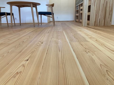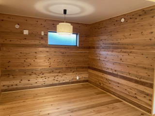 床はとちぎ八溝杉の4000×30×240(働き幅)で、壁は自然素材の塗り壁と杉の羽目板貼りです。