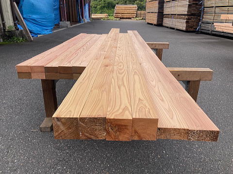 一方、床板は弊社の提案で芯付赤特等を採用して頂きました。芯付かつAD材のため105の面の片方に干割れが入りますが、干割れの入った面を下場にしてご使用頂いております。しかも芯に近いため、死節が無く、とてもきれいに見えます。さらに天然乾燥のため芯去KD材よりもコストパフォーマンスに優れているためお勧めしました。ちなみに弊社のウッドデッキの床も芯付き材を使用しております。
